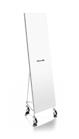 The Narciso mirror moves on three wheels and comes with a handle at its center that makes it easy to move (while the triangular base ensures stability). The frame has several coat hooks for hanging clothes, accessories or a quick change.